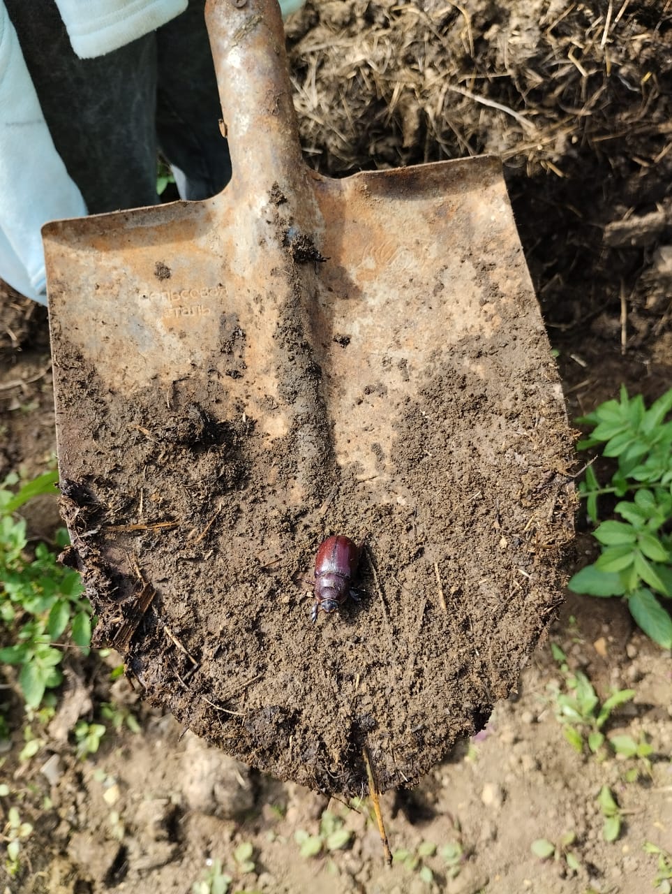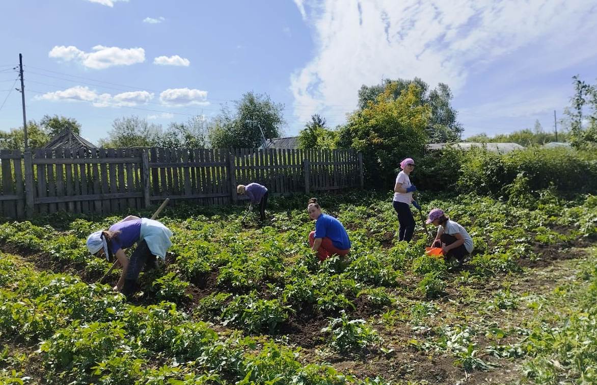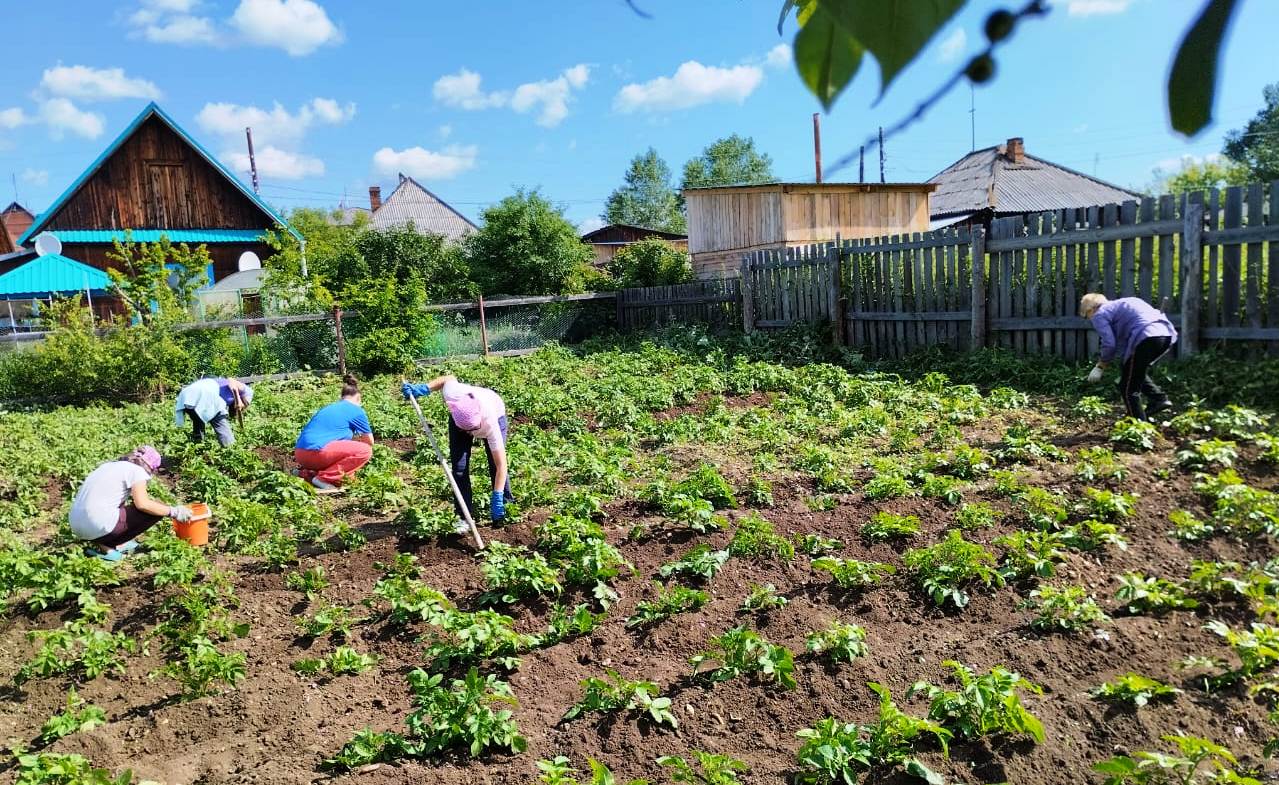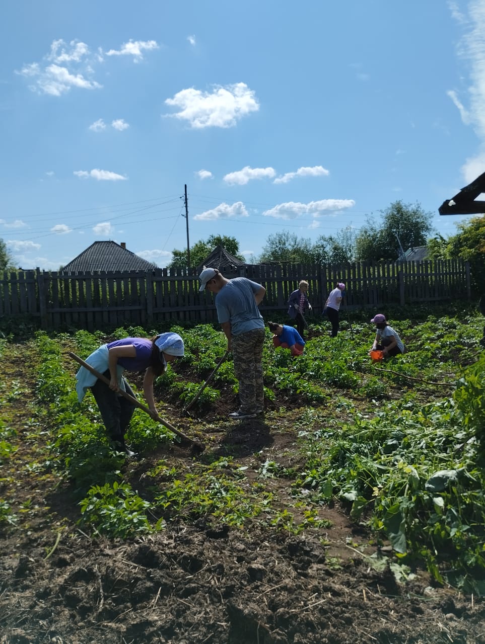 Вот и подросла наша картошечка. Пришло время её окучивать. Погода стоит хорошая: жара, комары… Но, нас ничем не напугать!